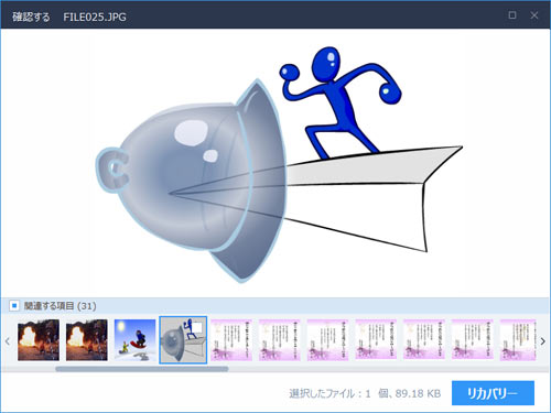 ファイルを選択して「リカバリー」ボタンを押せば復元です。簡単すぎで不安になるくらいですね。